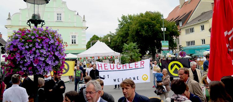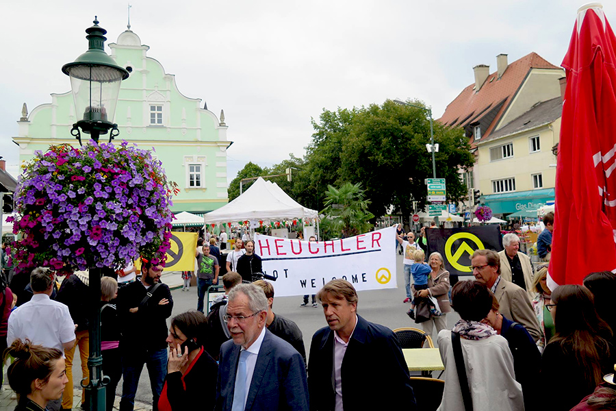 Am Nachmittag des 12.08.2016 um 16:00 Uhr haben ca. 20 Aktivisten der Identitären Bewegung Alexander Van der Bellen mit einem Transparent in Voitsberg begrüßt. Das Transparent trug die Aufschrift: „Heuchler nicht willkommen!“