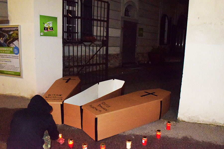 Deshalb haben identitäre Aktivisten beschlossen, die Grünen mit den Folgen ihrer Politik zu konfrontieren. Sie haben drei Särge vor der Grünen Landesparteizentrale in Graz niederlegt, die mit Bildern von Terroropfern gefüllt waren. Den Grünen muss gezeigt werden: „An Euren Händen klebt Blut! Ihr könnt eure schönen Parolen noch so oft wiederholen, wir wissen, was ihr letzten Sommer getan habt!“