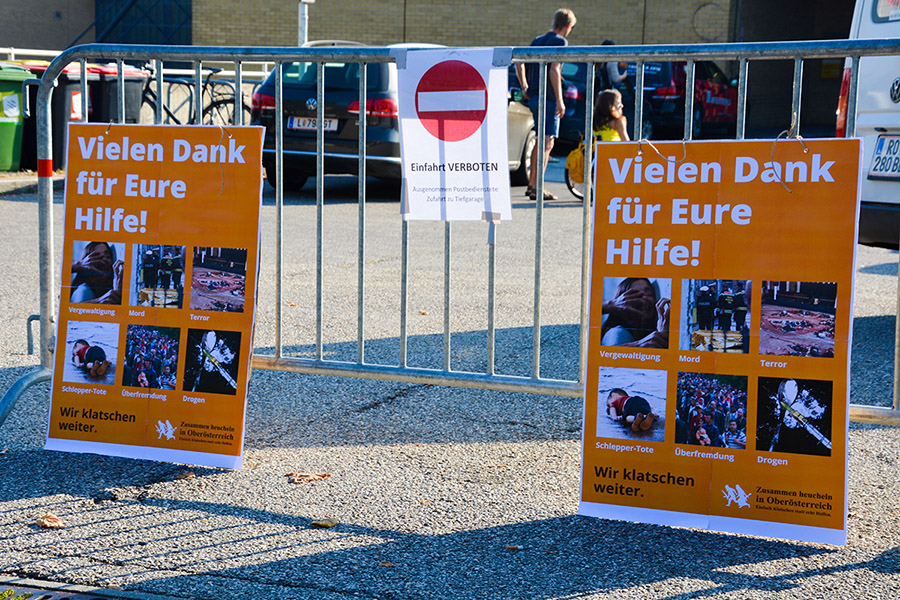 Auch identitäre Aktivisten haben beschlossen, sich zu bedanken. Sie haben mit einer Beschilderung ausgeholfen und zeigen auf, was ohne die Befürworter offener Grenzen unmöglich wäre: Terror, Morde, florierender Drogenhandel, Vergewaltigungen, Schlepper-Tote und Überfremdung. Spätestens seit Bataclan, Wien, Köln und den letzten sexuellen Belästigungen während des Welser Volksfestes durch Asylanten, sollte sich die Asyllobby lieber in dunklen Ecken schämen.