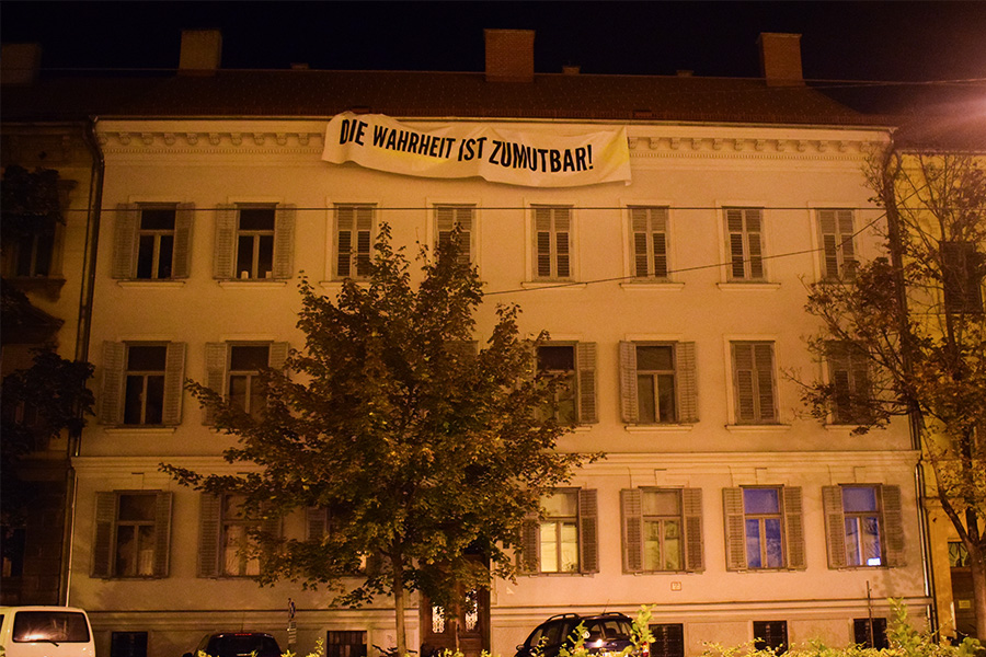 Identitäre Aktivisten stiegen am 25.9. auf ein dreistöckiges Hochhaus gegenüber des Landesgerichtes Graz und breiteten ein Transparent mit dem Spruch: „Die Wahrheit ist zumutbar“ aus. Am 27.9. folgte ein Flashmob.