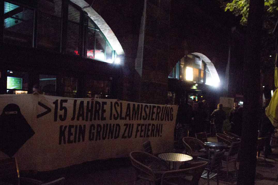 Identitäre Aktivisten nahmen diese Aktion zum Anlass, um den „Grünen“ ihre heuchlerische Politik vor Augen zu halten. Sie breiteten direkt vor dem entsprechenden Lokal ein Transparent mit der Aufschrift „>15 Jahre Islamisierung – kein Grund zu feiern!“ aus. Zudem intervenierten sie kurzzeitig bei der Veranstaltung selbst und warfen Flyer mit derselben Aufschrift in die Menge.