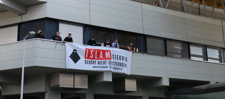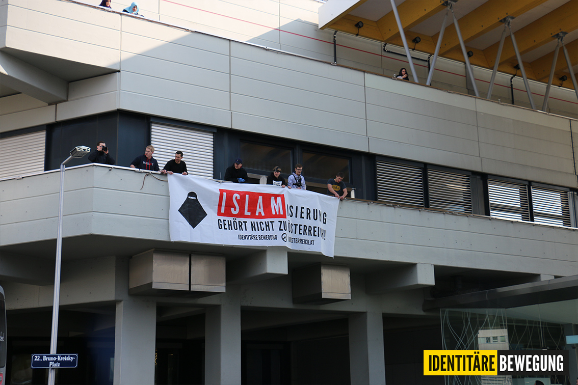 Aktivisten entrollten um 11h, zu Beginn des Treffens, direkt über dem Eingang ein Banner mit der Aufschrift: „Islamisierung gehört nicht zu Österreich“.