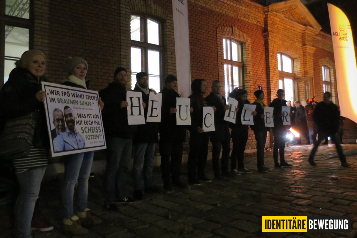 In der „Marx-Halle sammelte sich ein elitärer Kreis aus Wirtschaft und Medien, das einfache Volk hatte keinen Zutritt. Wir zeigten dennoch den Veranstaltern und Besuchern was wir von ihnen halten. Bellen ist ein Heuchler.