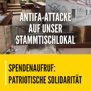 Jetzt ist patriotische Solidarität gefragt! Damit der Wirt nicht auf den Kosten sitzen bleibt, starten wir einen Spendenaufruf. Gerade in solchen Situationen ist es wichtig, sich solidarisch zu zeigen und den Betroffenen nicht das Gefühl zu geben, alleine zu sein. Denn damit würden die Aktionen der Linksextremisten fruchten. Zeigen wir ihnen hingegen, dass wir als Patrioten in Österreich zusammenhalten und uns gegenseitig unterstützen! Getroffen hat es einen, doch gemeint sind wir alle.