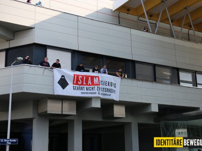 Heute demonstrierten rund 20 Identitäre in einer spontanen Aktion gegen das „Jubiläum“ der „Muslimischen Jugend“ in Österreich.