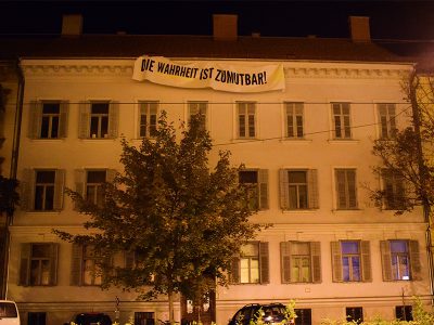 Identitäre Aktivisten stiegen am 25.9. auf ein dreistöckiges Hochhaus gegenüber des Landesgerichtes Graz und breiteten ein Transparent mit dem Spruch: „Die Wahrheit ist...